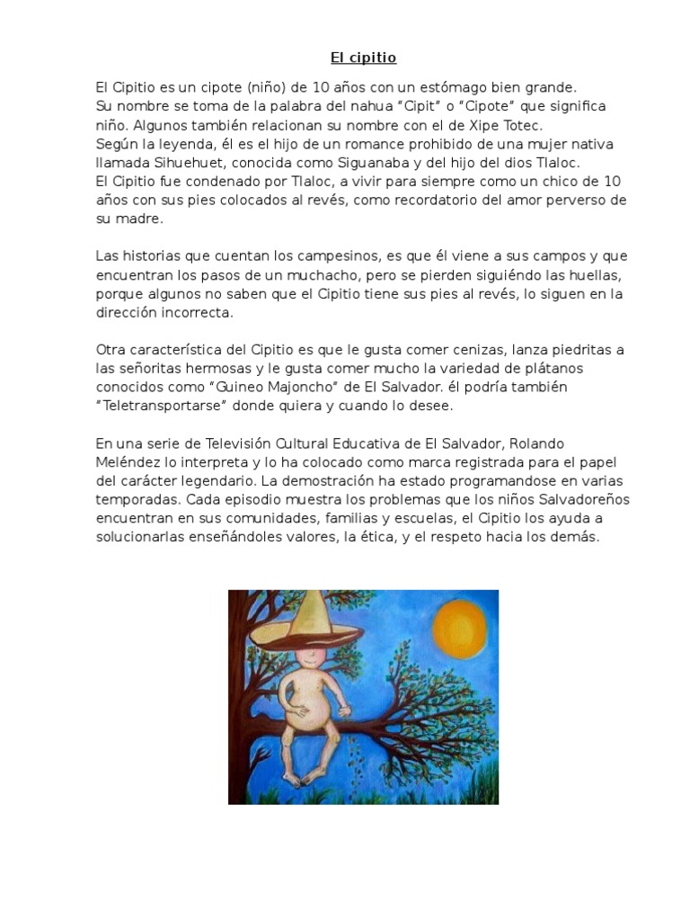 El Cipitío Leyenda De acuerdo a la mitología salvadoreña el Cipitío era el hijo de la Siguanaba la cual era conocida como Sihuehuet que significa mujer hermosa. Este es conocido por sus fantasmas y el ambiente embrujado que impregna la imaginacin de sus habitantes y visitantes. En eso una fuerte tormenta azota su barco a lo que el capitán se resistió con fuerza y determinación.