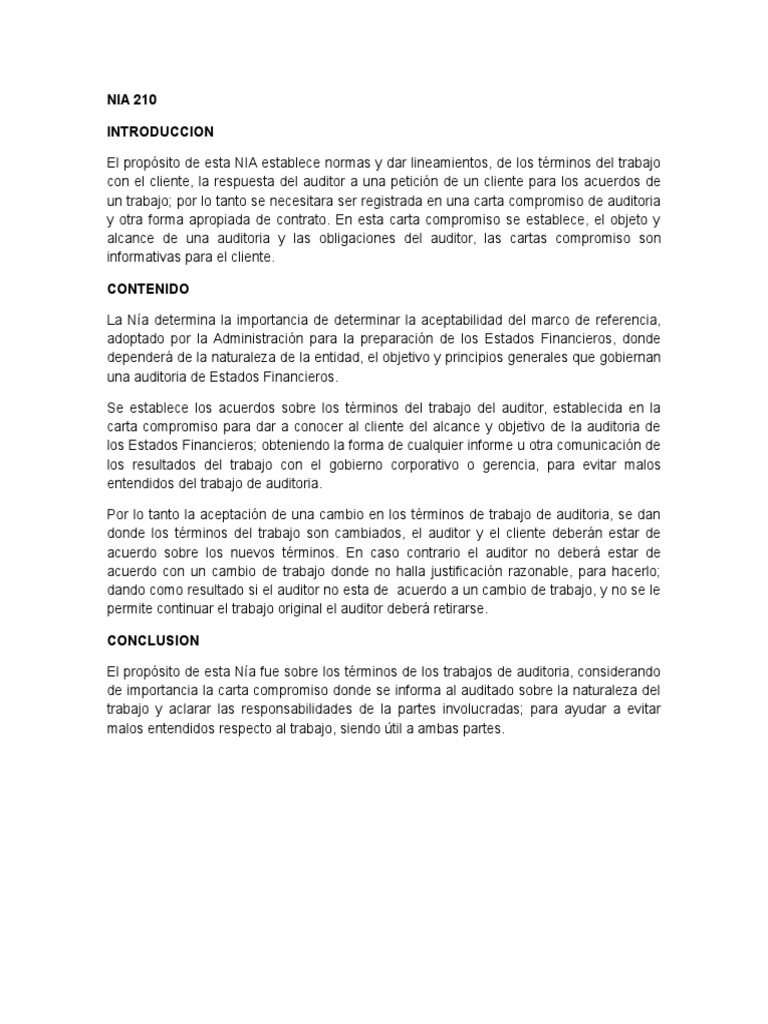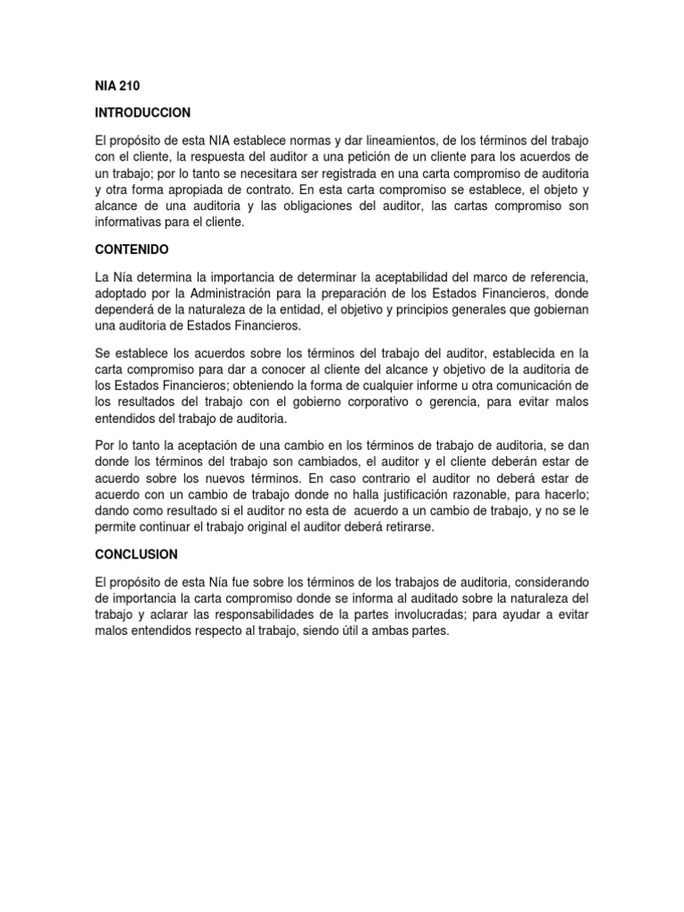 131 NIA 210 ACUERDO DE LOS TÉRMINOS DE LOS TRABAJOS DE AUDITORÍA. Report Nia 210 Resumen Please fill this form we will try to respond as soon as possible. Download Nia 210 Resumen Comments.