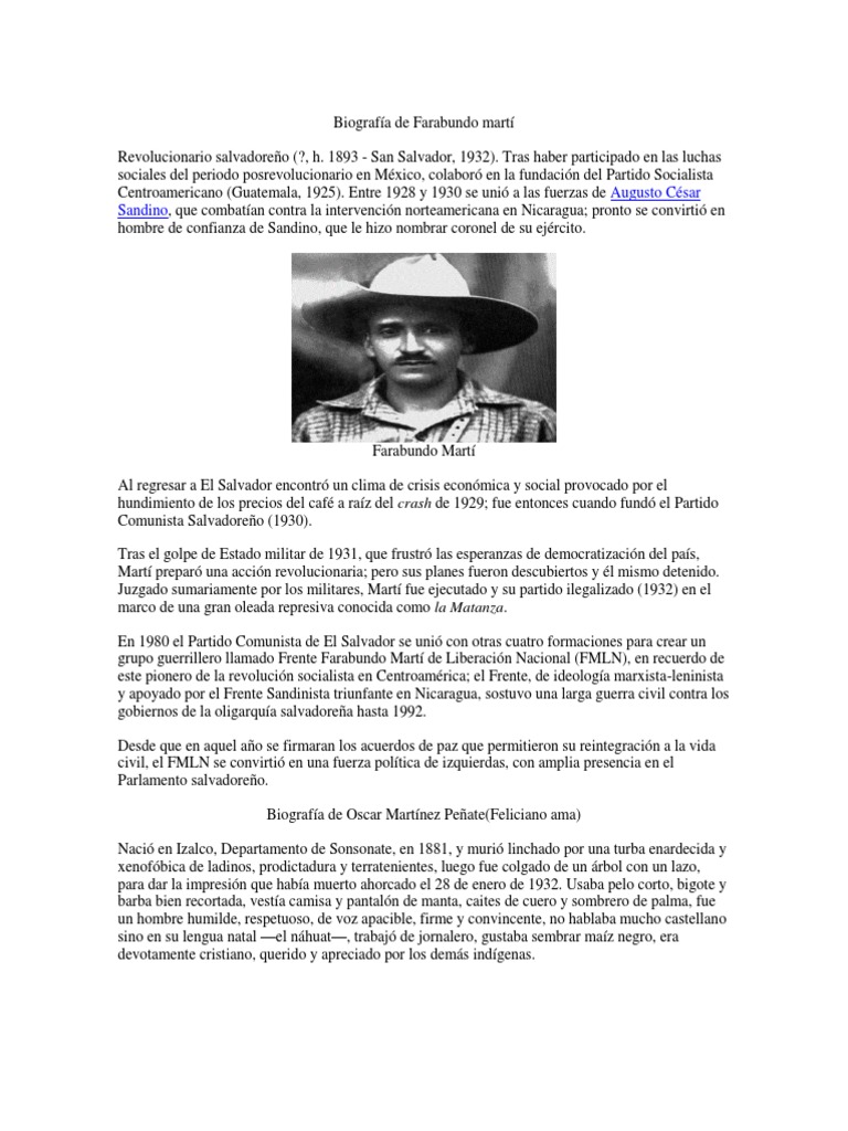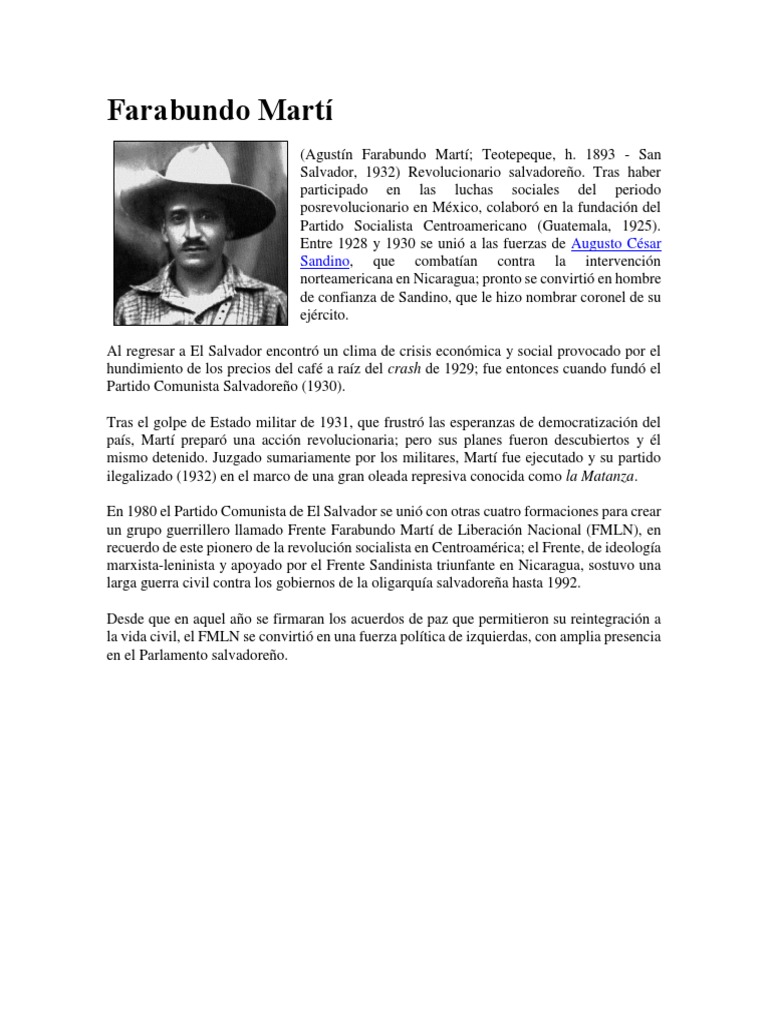 Biografia de farabundo marti resumen. 1893 - San Salvador 1932. Biografía de Farabundo Martí. Tras haber participado en las luchas sociales del periodo posrevolucionario en México colaboró en la fundación del Partido Socialista Centroamericano Guatemala 1925.