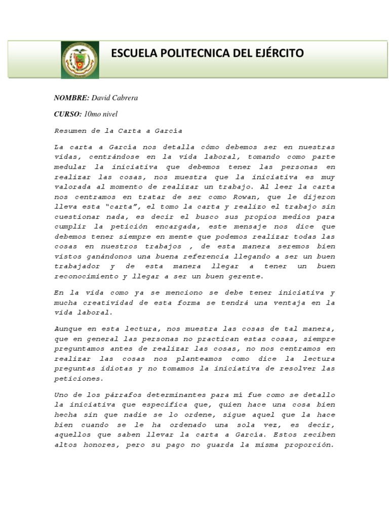 La carta a garcia resumen. 10mo nivel Resumen de la Carta a Garca La carta a Garca nos detalla cmo debemos ser en nuestras vidas centrndose en la vida laboral tomando como parte medular la iniciativa que debemos tener las personas en realizar las cosas nos muestra que la iniciativa es muy valorada al momento de realizar un trabajo. La carta a garcia resumen corto Elbert Hubbard escribió este ensayo en una hora en 1899 como un añadido al número de marzo de su revista The Philistine. Rowan recibió la carta de manos de su superior McKinley él solamente la tomo y la guardo en un bolsillo que traía colgado en el pecho cerca del corazón a los cuatro días subió a una balsa que.