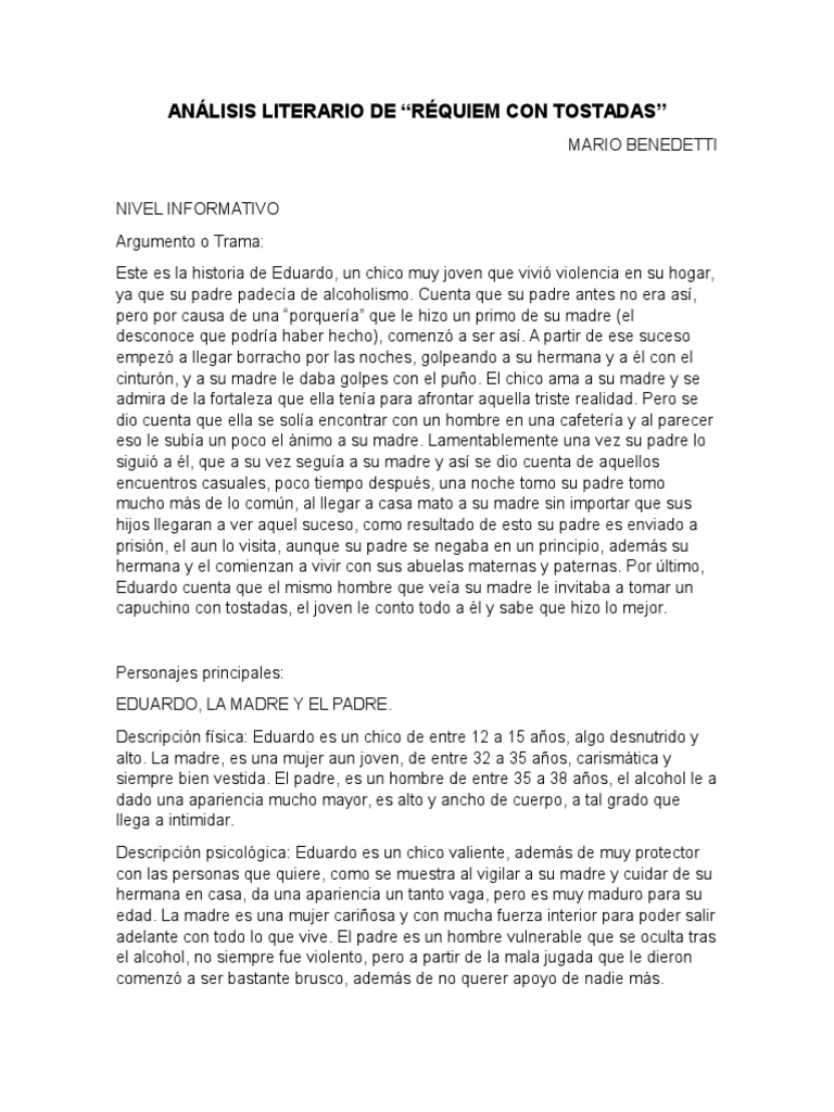 Este es la historia de Eduardo un chico muy joven que vivió violencia en su hogar ya que su padre padecía de alcoholismo. Requiem Con Tostadas Requiem con tostadas En este cuento la situación que presenta es la de un adolescente que le confiesa al amante de su madre la vida. Mario Benedetti Nació el 14 de setiembre de 1920 en Paso de los Toros Uruguay.