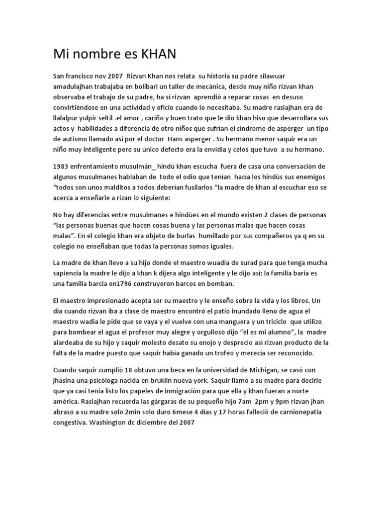 Análisis de la pelicula. La película trata de Rizwan Khan quien padece del síndrome de Asperger. En un da de esos conoce a una bella mujer hind divorciada llamada Mandira con quien se casa la cual tiene un hijo de 11 aos.