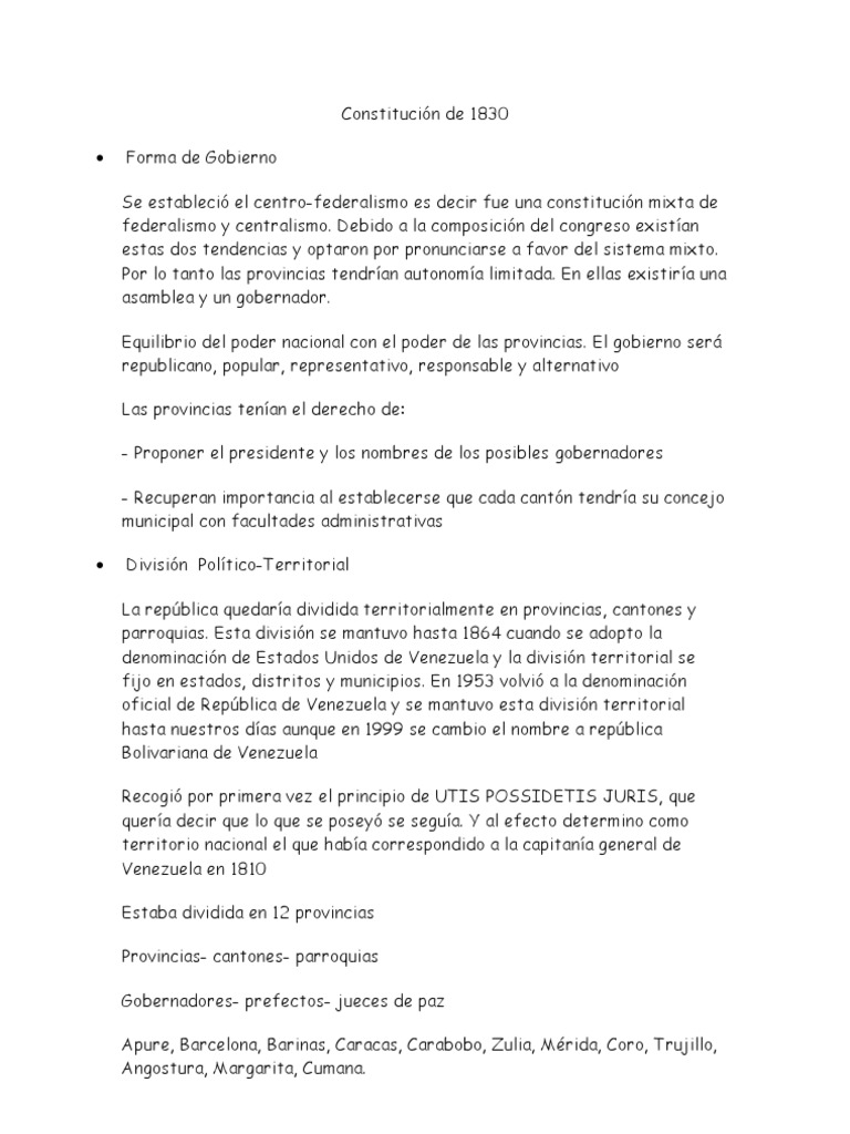 Nosotros los Representantes del Estado del Ecuador reunidos en Congreso con el objeto de establecer la forma de Gobierno más conforme a la voluntad y necesidad los pueblos que representamos hemos acordado la siguiente. Para 1830 Venezuela estaba en medio de una crisis económica muy fuerte que causaba descontento dentro de las elites económicas. Primera constitución del Ecuador 1830 - Resumen de la Carta Magna de 1830.