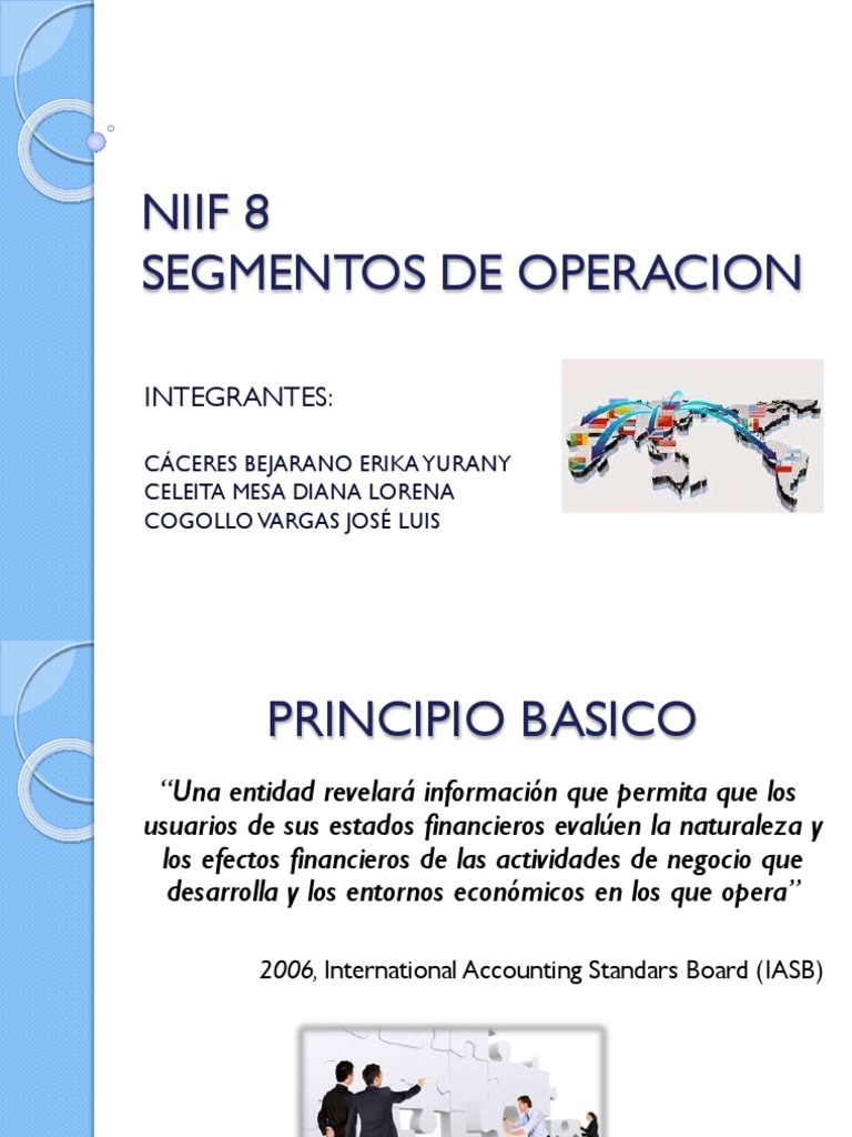 Huertas Rugel Lilibhete Quispe Ticona Guillermo Quispe Clares María Claudia Santillán Pizarro kely Reátegui Ríos Marjorie Aula. Se trata de una norma que arrastra una considerable polémica ya que su aprobación fue bloqueada por el Parlamento Europeo al considerarla como una copia de la norma estadounidense SFAS 131 y reducir los requerimientos de revelación de información con respecto a su antecesora la NIC 14. Objetivo de la NIIF 8.