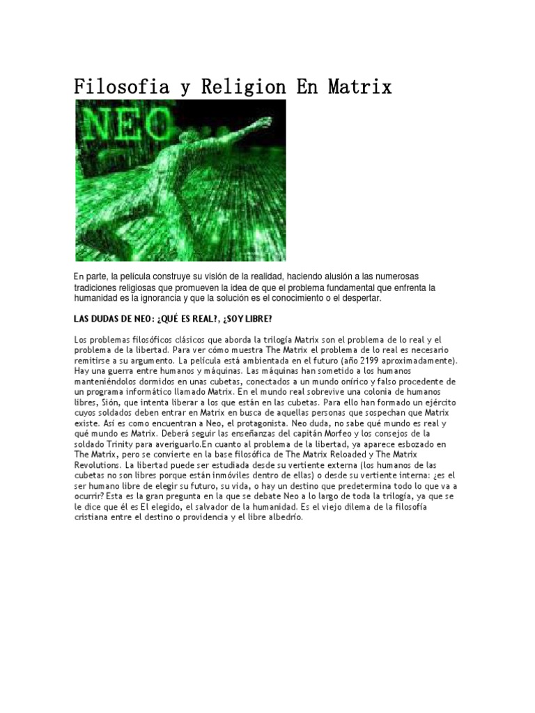 Matrix filosofia y cine. Se trata de una tarea guiada que busca que aprendas cómo redactar un análisis bien estructurado claro y con la calidad de una publicación accesible para cualquier lector ajeno a la clase. Un mundo dominado por las máquinas las cuales esclavizan a la Humanidad para utilizar.