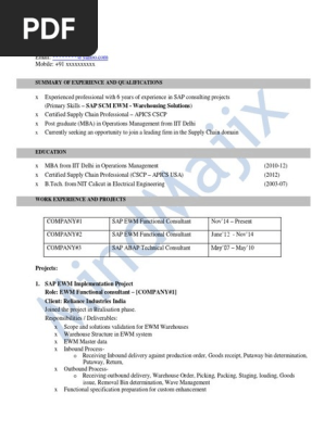Sap Ewm Sample Resume 1 Warehouse Sap Se