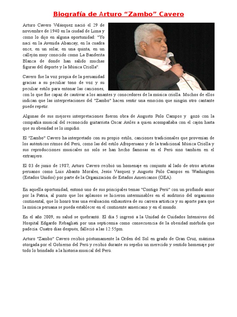 Como resultado de su larga y prolífica trayectoria profesional Cavero supo ganarse el cariño y la admiración del pueblo peruano. Arturo zambo cavero biografia resumen Si tienes más tareas a hacer puedes utilizar la barra de búsqueda que puedes encontrar justo arriba de la página y conseguir hacer tus trabajos ahora. Biografia De Arturo Zambo Cavero.