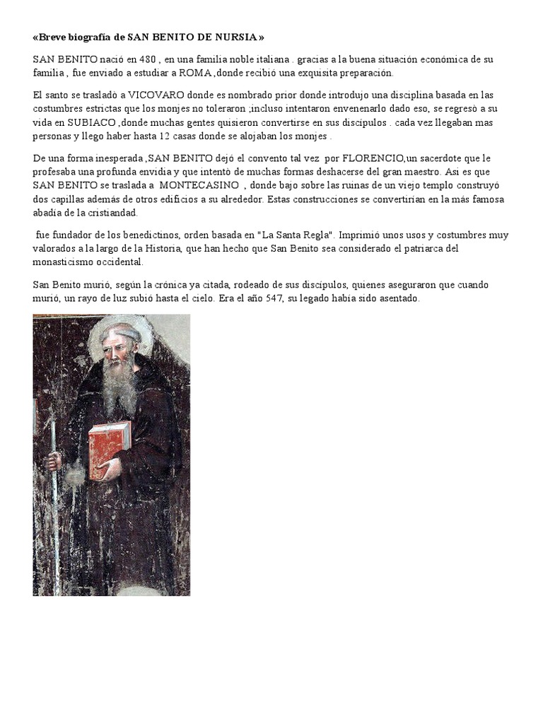 Ofrecemos este documento catolico de gran importancia en el que se relatan los princip. Es el fundador del monacato occidental. Benito de Nursia conocido como San Benito nació en Nursia cerca de la ciudad italiana de Spoleto 480 Montecasino 547 fundó la orden de los benedictinos y es considerado patrón de.