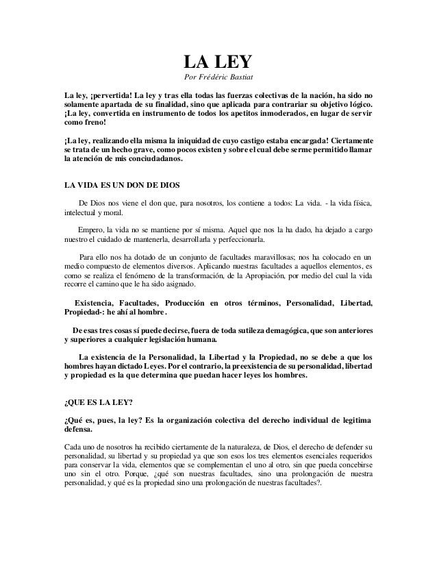 Se resumen en el triple dogma que expresan estas. La Ley Resumen El autor en la lectura nos lanza varios enunciados acerca como la ley que es una creación humana pensada actuar en legítima defensa de los seres humanos y sustituir las fuerzas individuales se ha corrompido y hace todo lo contrario a los fines por cuales fue creada las tres ideas que he tomado para desarrollar este análisis son. Filosofía política que promueve un orden político y legal que respete el espacio de cada persona propiedad privada y permita la libertad de elegir libre mercado.