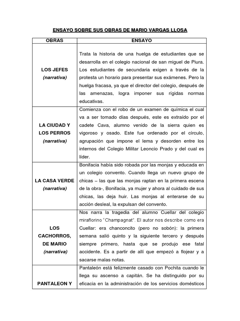 Ensayo Sobre Sus Obras De Mario Vargas Llosa Peru