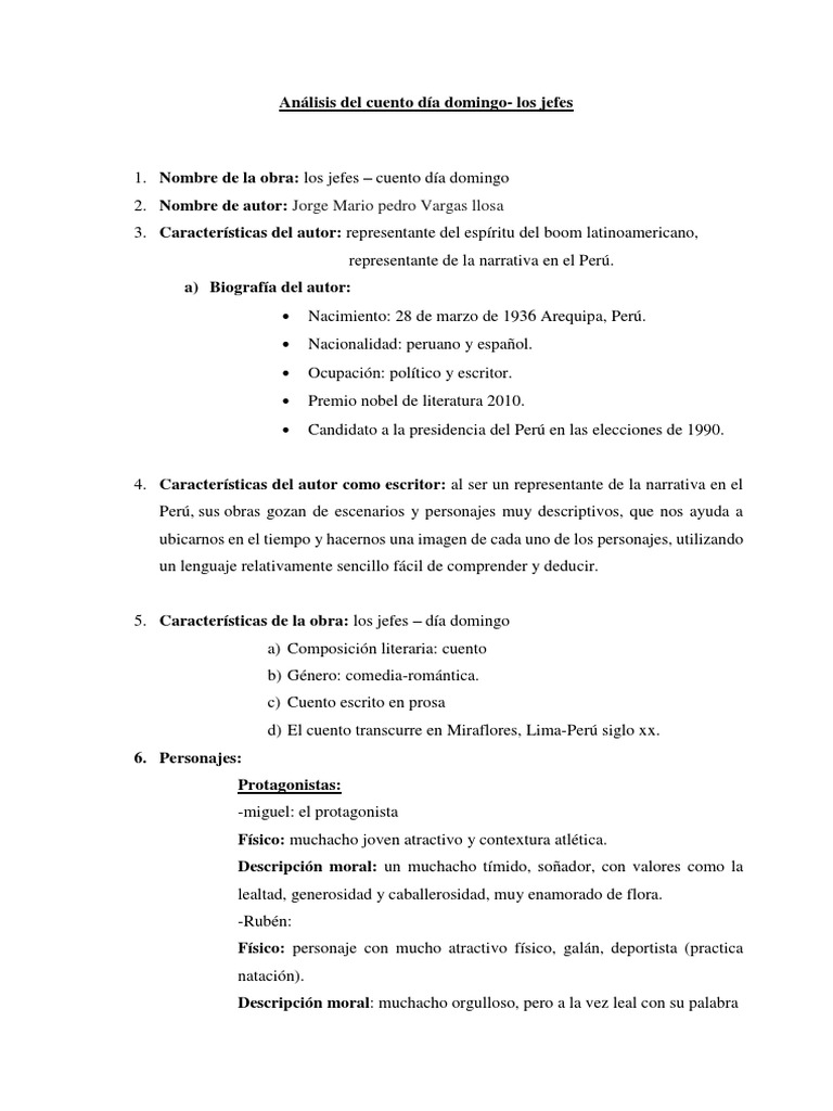 Los personajes principales de la obra día domingo de Mario Vargas Llosa. Día domingo de Mario Vargas Llosa es un relato que recrea el mundo de un grupo de adolescentes limeños de los años 50. Mario Vargas Llosa representa un estilo narrativo muy innovador.