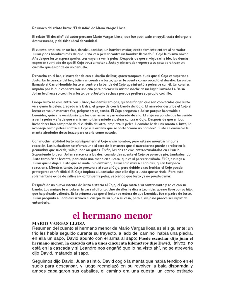 Perú es uno de esos casos y quizá Mario Vargas Llosa Arequipa Perú 28 de marzo de 1936 el autor elegido para el estudio no sea tan conocido hoy como cuentista pero fue precisamente con el relato breve con lo que el hoy premio Nobel peruano entró de lleno al mundo de la literatura. Este relato trata de otro desafío en esta ocasión incruento aunque con riesgo de acabar fatalmente. Vio que ella enrojecía bruscamente como si alguien hubiera golpeado sus mejillas que eran de una palidez resplandeciente y muy suaves.