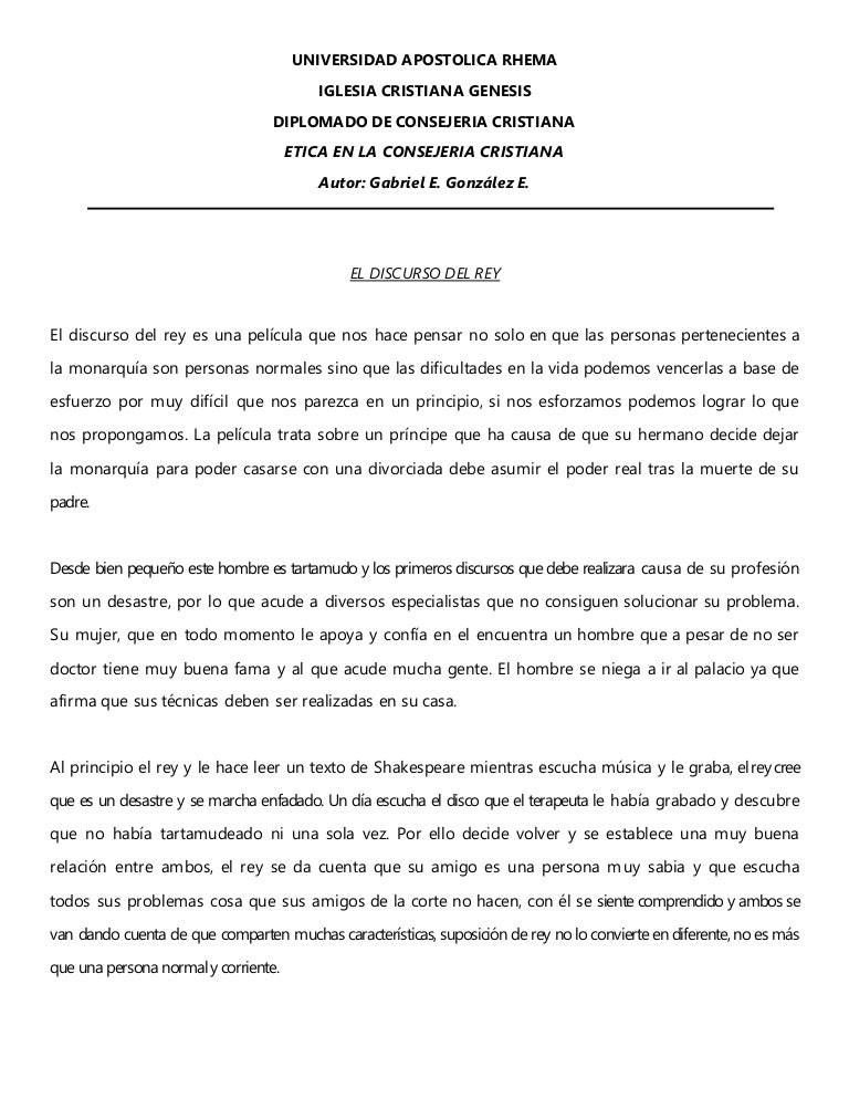 Le dice que su hermano David el prncipe de Gales traer a la familia a la ruina y al pas como rey. Despus del discurso el rey le explica a su hijo la importancia que tiene la radiodifusin en la. ENSAYO EL DISCURSO DEL REY El duque de york tena miedo de hablar en pblico sabia en su interior que alguna vez tena que hacerlo pues era una figura pblica.