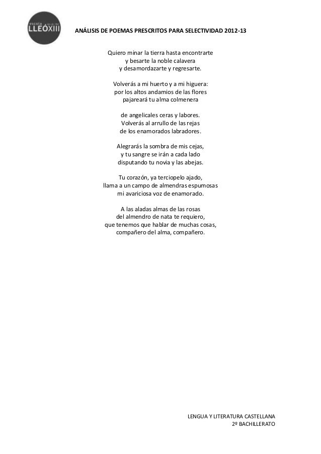 Elegía a Ramón Sijé de Miguel Hernández y análisis literario del mismo. Desde pequeño ayuda a su padre que trabaja como pastor de ovejas. 12 sílabas 11 1.