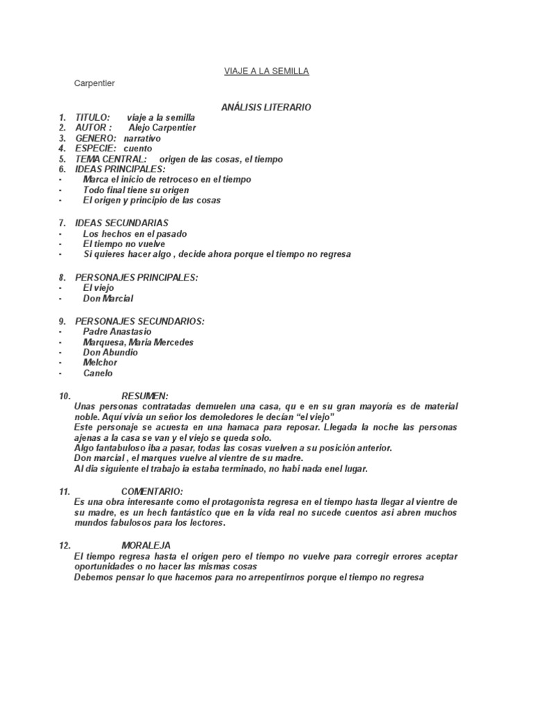 RESUMEN VIAJE A LA SEMILLA - Alejo Carpentier RESUMEN DE LA OBRA LITERARIA VIAJE A LA SEMILLA - Alejo Carpentier Argumento de Viaje a la semilla libro de Alejo Carpentier. Marcial protagonista de Viaje a la semilla viaja en el tiempo desde la muerte hasta la juventud y la infancia en un recorrido que culmina con el retorno al vientre materno. Vemos como la casa esta siendo demolida por unos obreros pero el autor lo narra de una manera extremadamente poética y con una abundancia de metáforas.