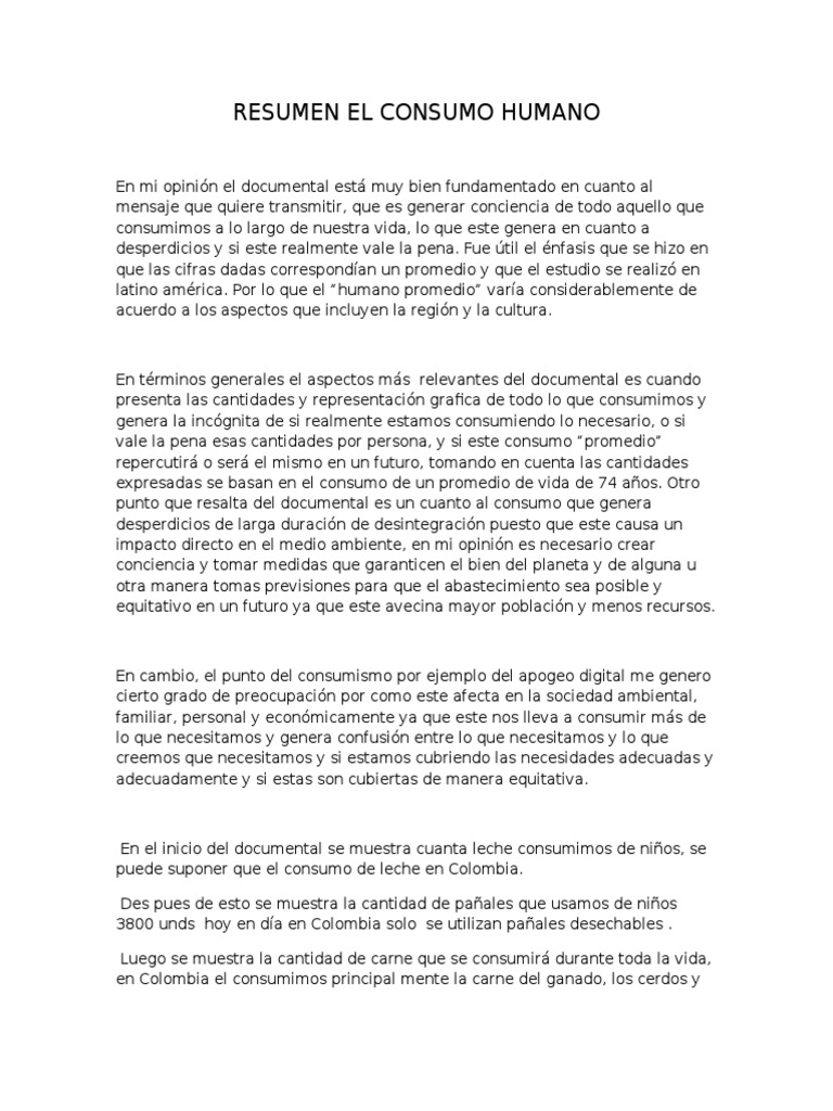 En mi opinin el documental est muy bien fundamentado en cuanto al mensaje que quiere transmitir que es generar conciencia de todo aquello que consumimos a lo largo de nuestra vida lo que este genera en cuanto a desperdicios y si este realmente vale la pena. El documental realizado por National Geographic llamado El consumo humano es sumamente interesante ya que muestra y relata nuestravida la de cada uno de nosotros promedio desde que somos niños hasta que morimos explicando lo que consumimos lo que desechamos lo que compramos lo que. Fue til el nfasis que se hizo en que las cifras dadas correspondan un promedio y que el estudio se realiz en.