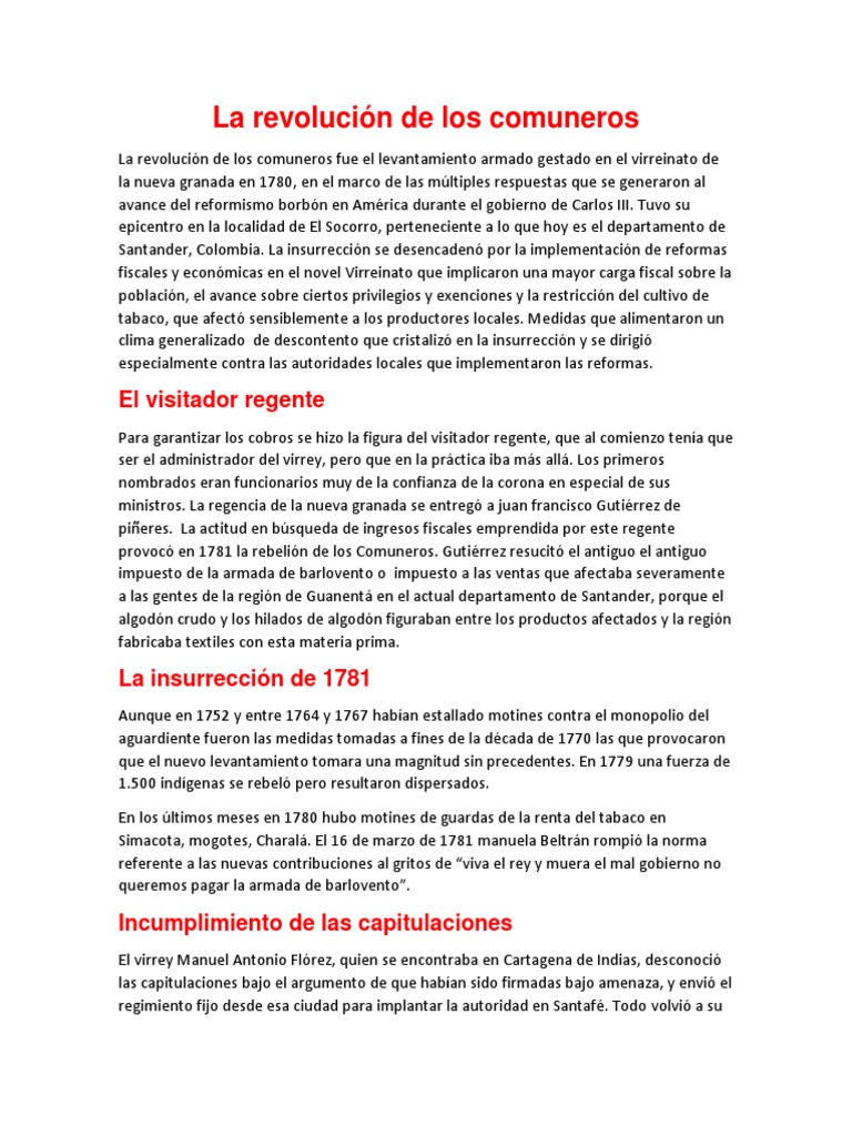 En resumen se estipulo la eliminación de varios impuestos mejores tratos hacia los indígenas reducción de precios y el destierro del Regente y más participación local para los. En 1520 un grupo de revolucionarios castellanos se levantan contra el poder real de Carlos V iniciando una revuelta que convulsionó la península y amenazó con destruir el ordenamiento político de los Reyes Católicos. Abordar aspectos generales que permitan comprender por qué se generó el proceso de independencia del Virreinato de la Nueva Granada de la Monarquía española.