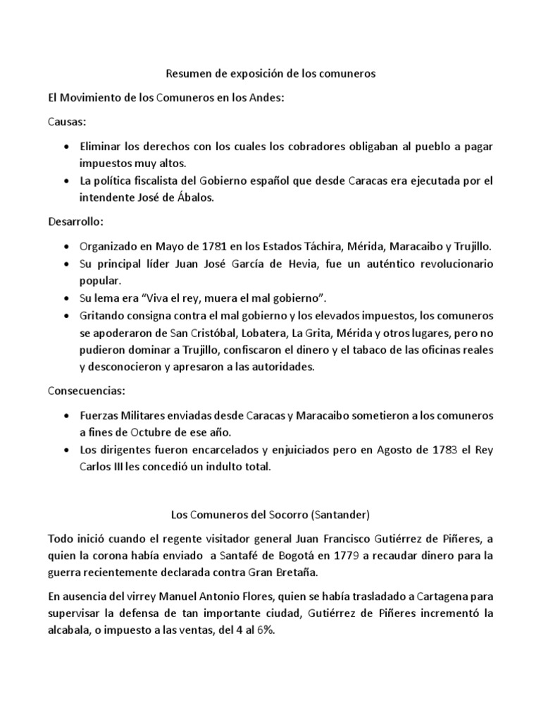 Organizado en Mayo de 1781 en los Estados Táchira Mérida Maracaibo y. El movimiento comunero también llamado guerra de las Comunidades se produjo en Castilla en 1520 poco tiempo después de la llegada del rey Carlos I a la península Ibérica en 1517Esta rebelión de los Comuneros fue protagonizada por algunas ciudades castellanas siendo encabezadas por Toledo. La petición de los Comuneros a la Santa Junta es un texto histórico-circunstancial de contenido político que resume las principales reivindicaciones del movimiento comunero frente a la nueva monarquía de los Habsburgo encabezada por Carlos I.
