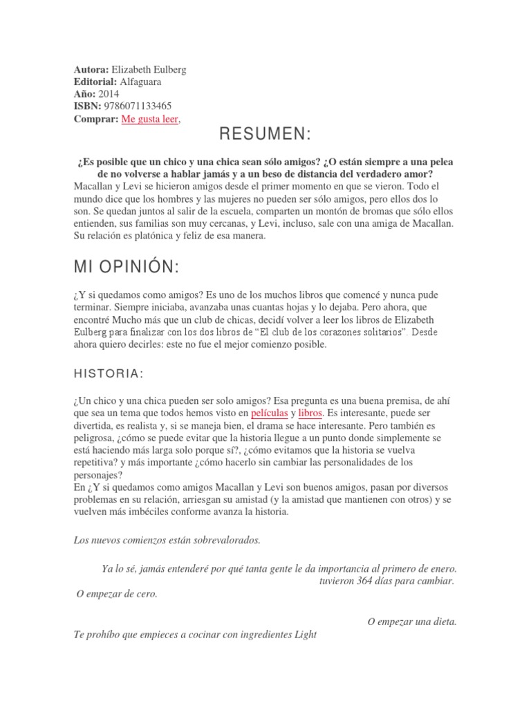 Este libro nos recuerda las diversas situaciones y conflictos por los que se pasa en este tipo de amistades desde el conflicto con la pareja mutua hasta la intervención de los padres o las diferencias entre amigos común. Este libro nos narra la historia de Macallan y Levi quienes son mejores amigos desde que se conocieron sintieron una conexión y comenzaron una amistad que con el. Y si quedamos como amigos en pdf.