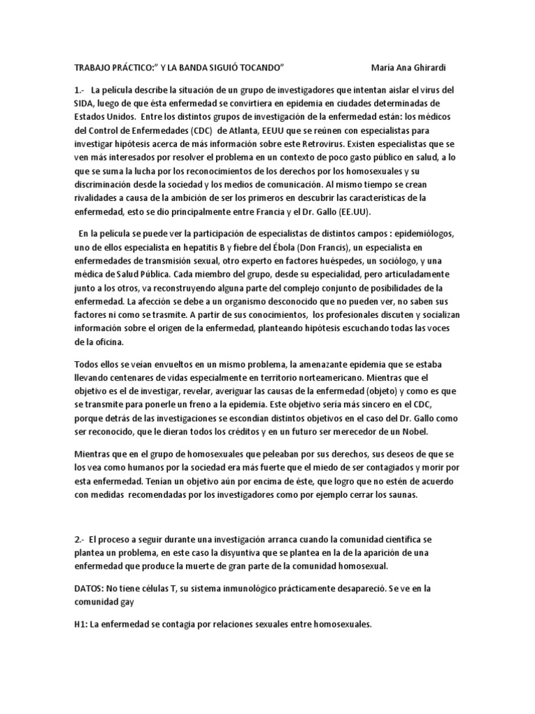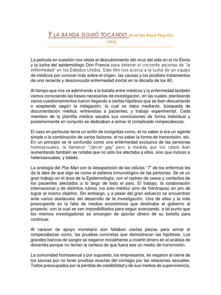 Un equipo de médicos investigan en conjunto con un sociólogo la aparición del virus del. En un momento de la película un enfermo habla de su pasado refiriéndose a si mismo como cuando era humano. Resumen de la pelicula y la banda siguio tocando de la Y La Banda Siguio Tocando 2992 palabras 12 páginas PRÁCTICO Nº2 -Y la banda siguio tocando Indice.