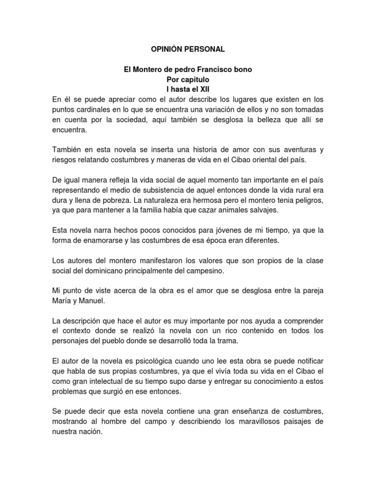 El montero resumen por capitulos. Pero estos alumnos no pueden elegir si ir o no al Talapot. En este último caso se agrega Quieres casarte conmigo. Con El Montero 1856 se empieza a conocer en Santo Domingo y en todo el resto de la América Hispánica la tradición de costumbres y mentalidades campesinas debido a la insistencia de Bonó por la descripción de lo que es la vida montuna la naturaleza del campo dominicano y las relaciones entre el personaje y el alcance de valores costumbres y decisiones políticas que se.