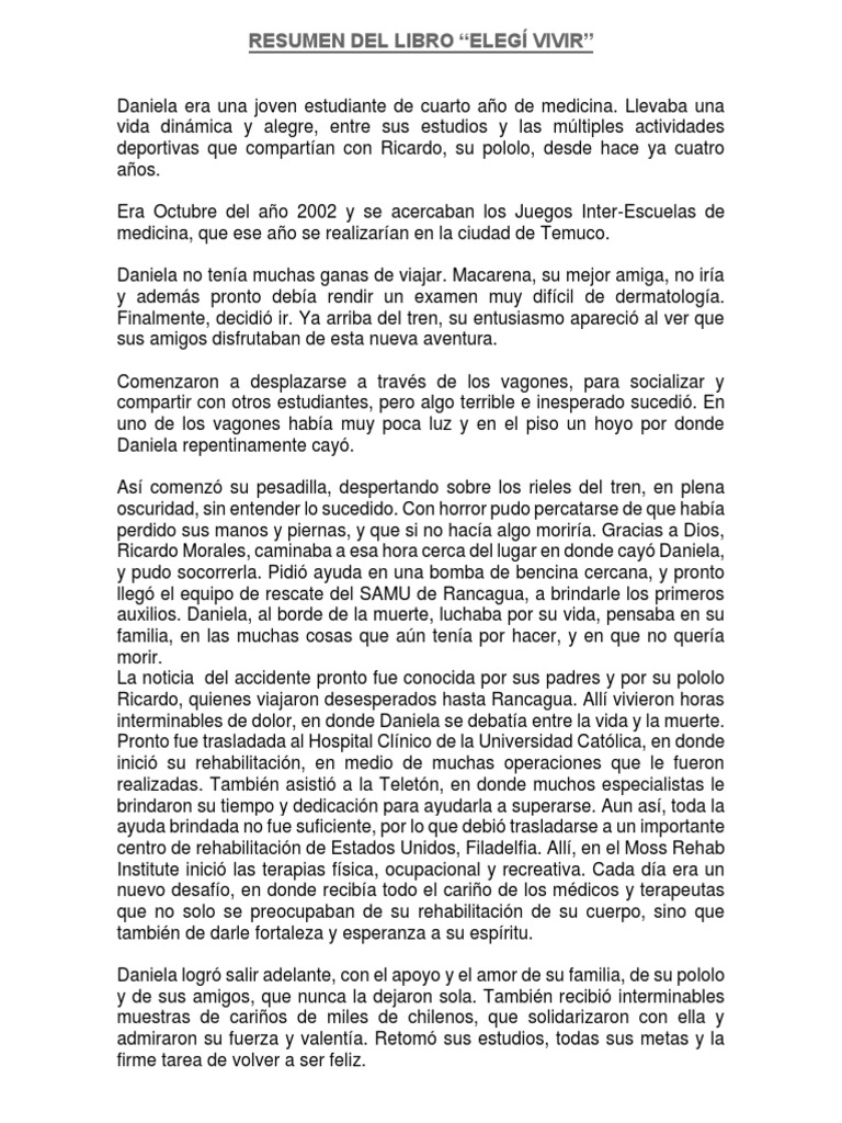 Resumen del Libro Elegí Vivir Autora. Dos años después de su accidente a través de este. Estaba en el segundo semestre de cuarto año de medicina con exámenes finales todos se inscribían a los JIM juegos inter-medicina consistían en competencias deportivas con todas las facultades de medicina ese año 2002 se harían en Temuco en la UC.