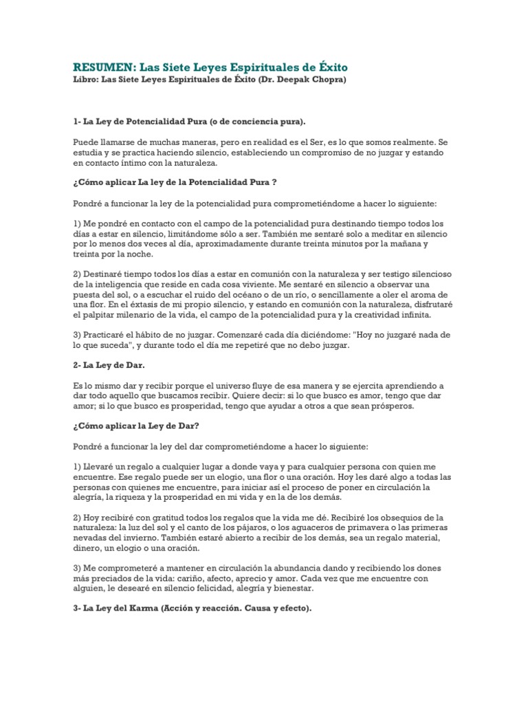 Las 7 leyes espirituales del exito resumen pdf. Resumen del libro de Deepak Chopra Las 7 leyes espirituales del éxito con ejemplos propios. Las siete leyes espirituales del éxito es un libro que recomiendo a todo el que forme parte de este viaje de auto realización y transformación personal adquirir un grado mayor de conciencia o simplemente se preocupe por ser mejor persona cada día. Las leyes espiritualeswwwuve svguillemlas_leye s_espiritualespdfti tulo.