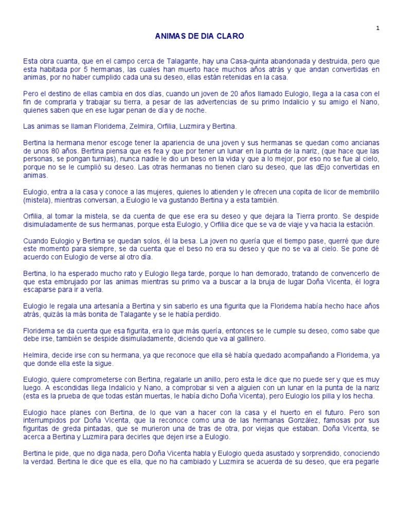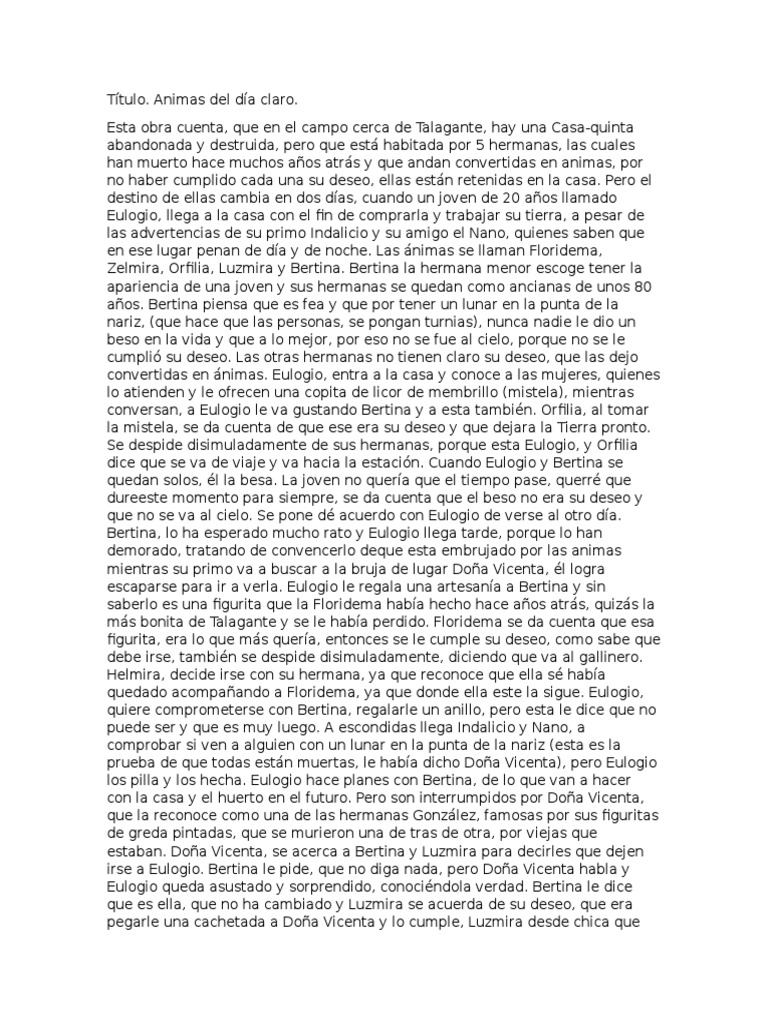 Animas de dia claro resumen. 2 2 Con referente al autor de la obra investigue cosas importantes de su vida y averigüe el por qué escribió esta obra. Ánimas de Día Claro es la historia de 5 hermanas que han fallecido hace unos cuantos años y que habitan una antigua casona cercana a Talagante. Ad Top Resume Builder Build a Perfect Resume with Ease.