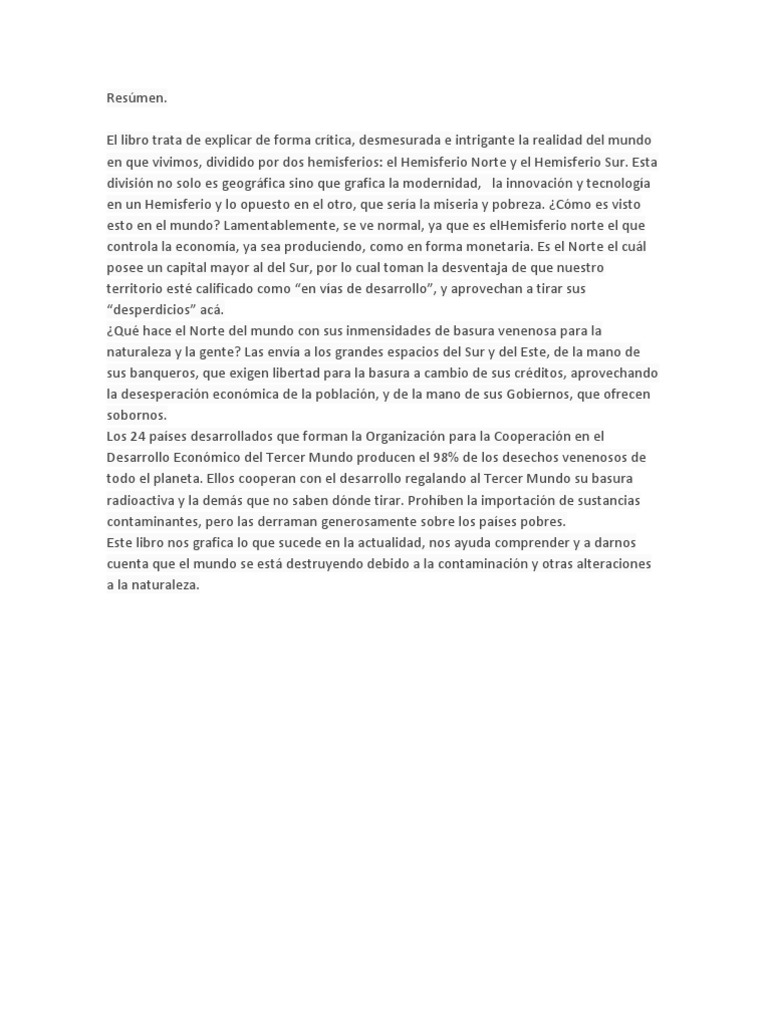 En esta obra el autor alerta sobre un sistema voraz cínico y perverso que atentó durante siglos y aún atenta contra hombres y tierras de Latinoamérica. Cinco frases que hacen crecer la nariz de pinocho Somos todos culpables de la ruina del planeta La salud del mundo esta hecha un ascoTodos somos culpables de esto ya que aportamos ahacerle daño. El libro trata de explicar de forma crítica desmesurada e intrigante la realidad del mundo en que vivimos dividido por dos hemisferios.